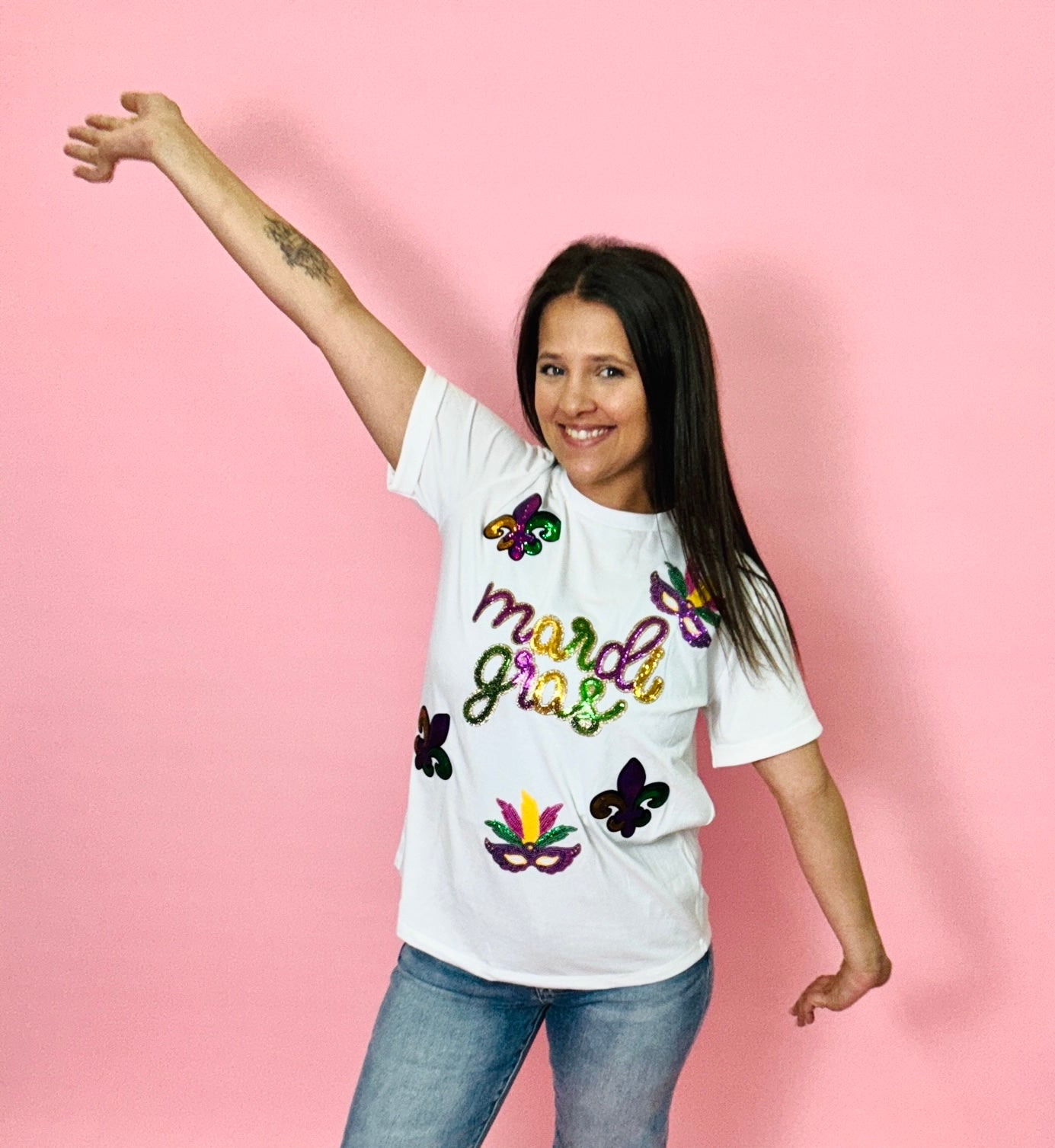 Celebrate the spirit of Mardi Gras in this eye-catching sequin tee. Shimmering details catch the light with every move, making you the star of any party. Perfect for festival season, themed events, or anyone ready to bring the festive vibes. Comfortable, bold, and undeniably fun.
