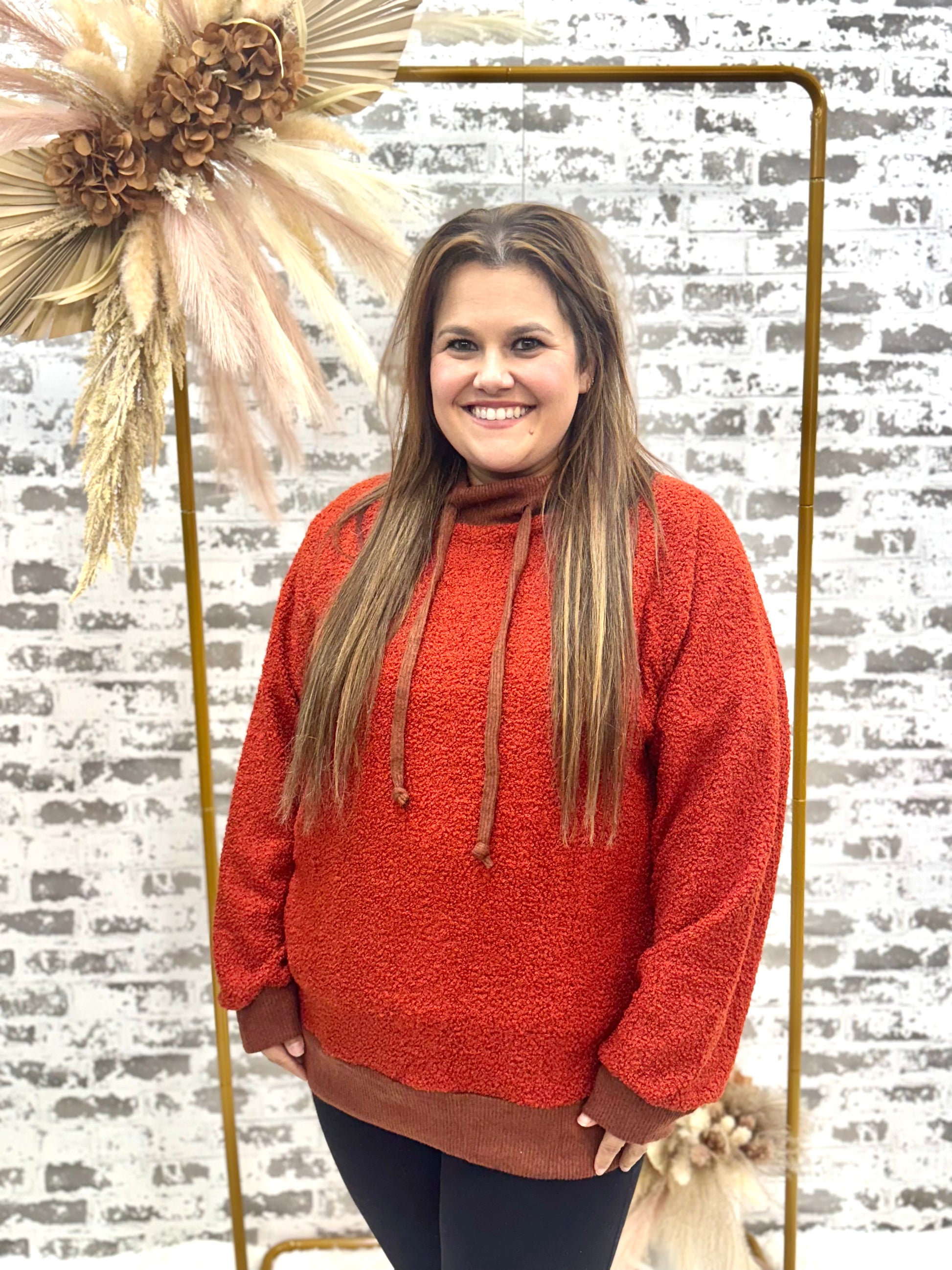 Cozy rust knit pullover with a brushed rib mock neck that's perfect for layering or wearing solo. The soft, textured fabric keeps you warm without the bulk, making it an easy go-to for casual days and cooler seasons.