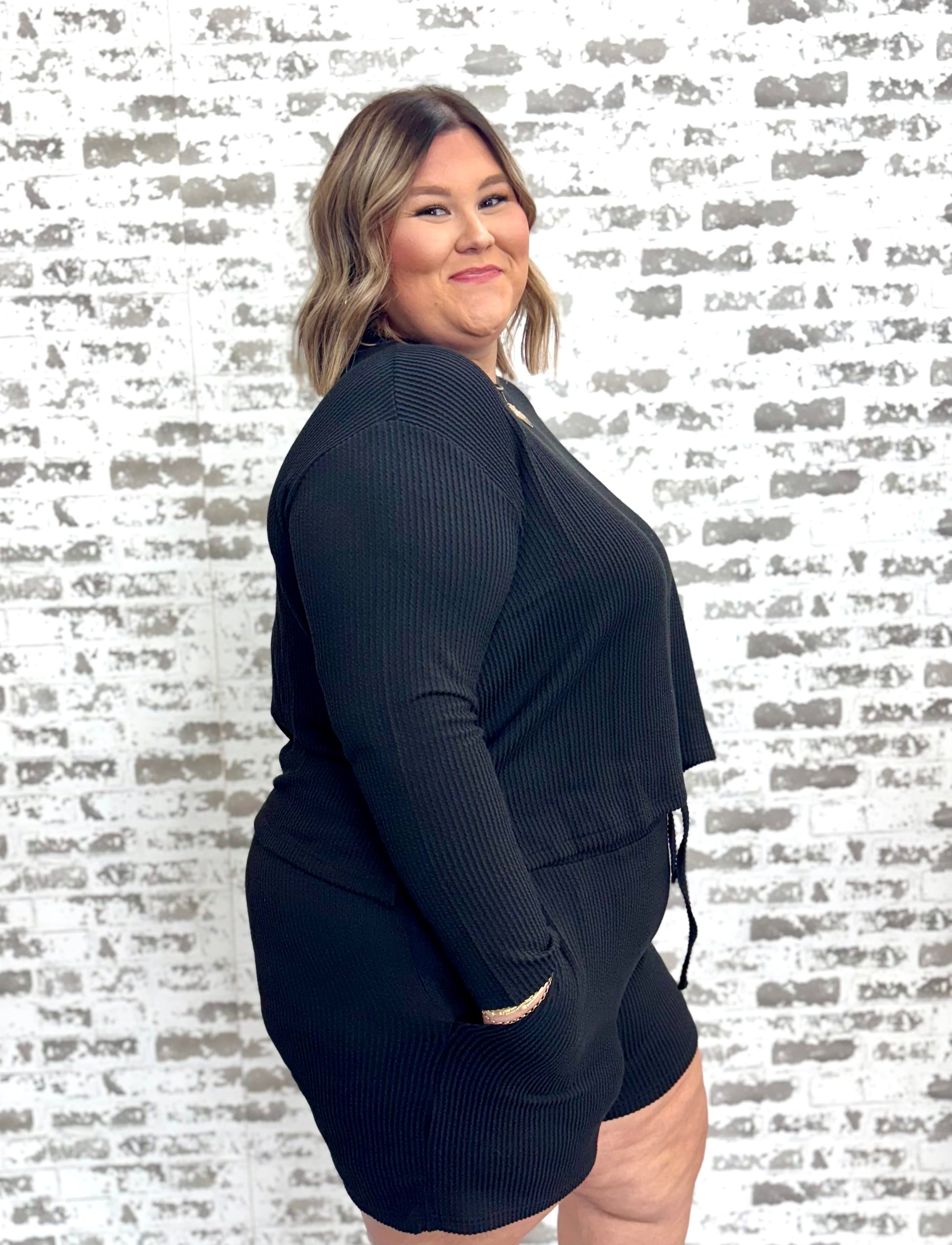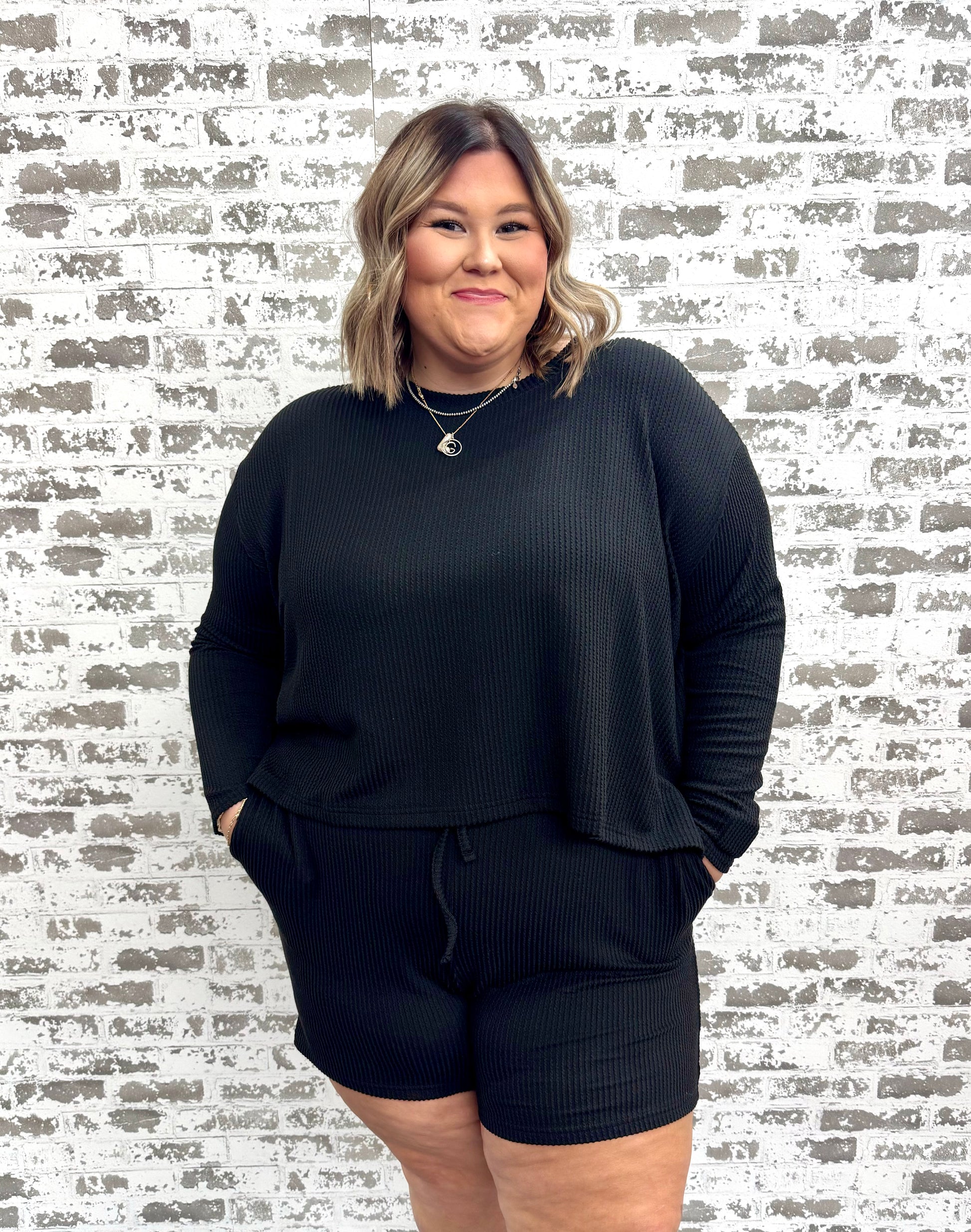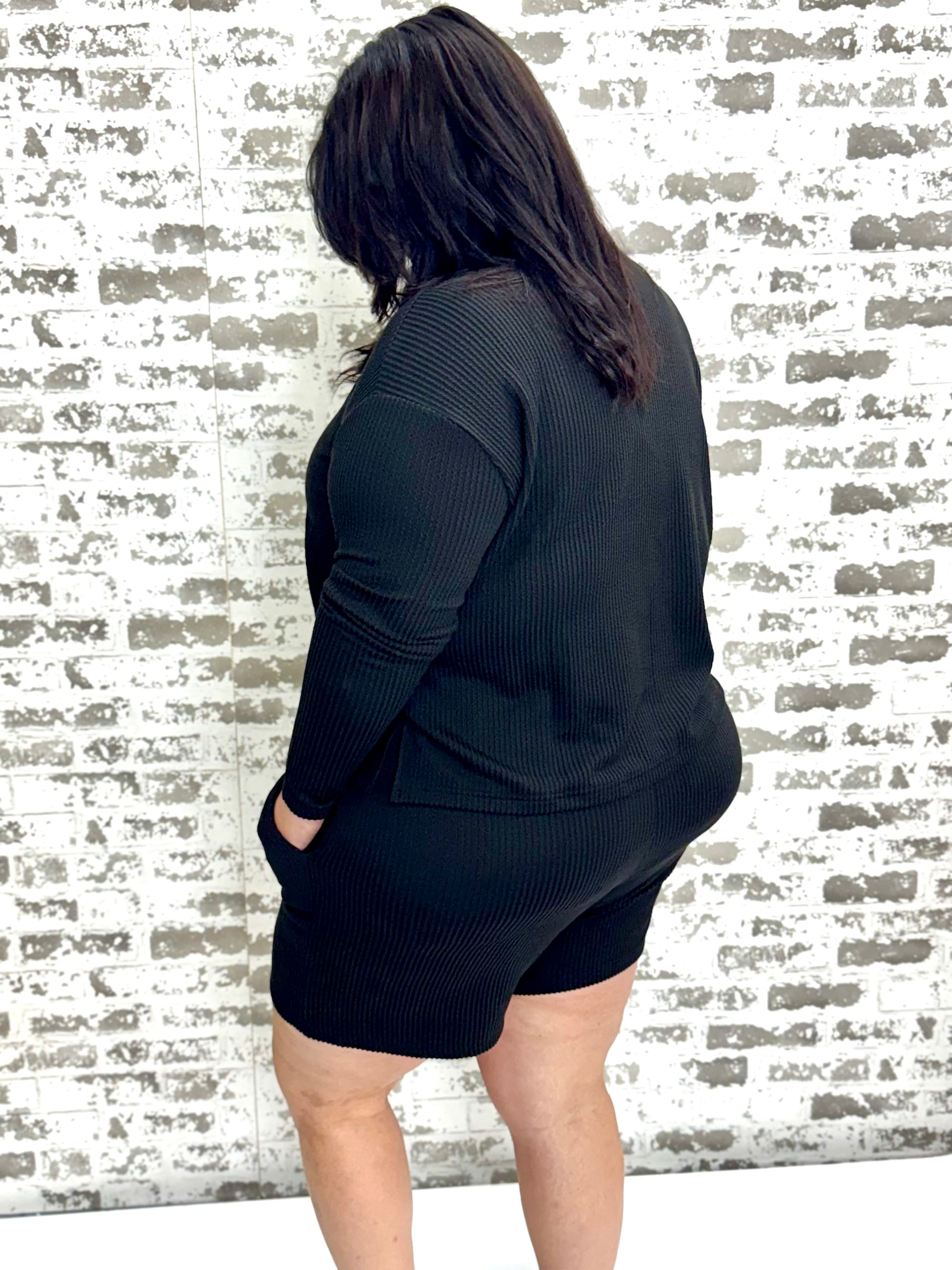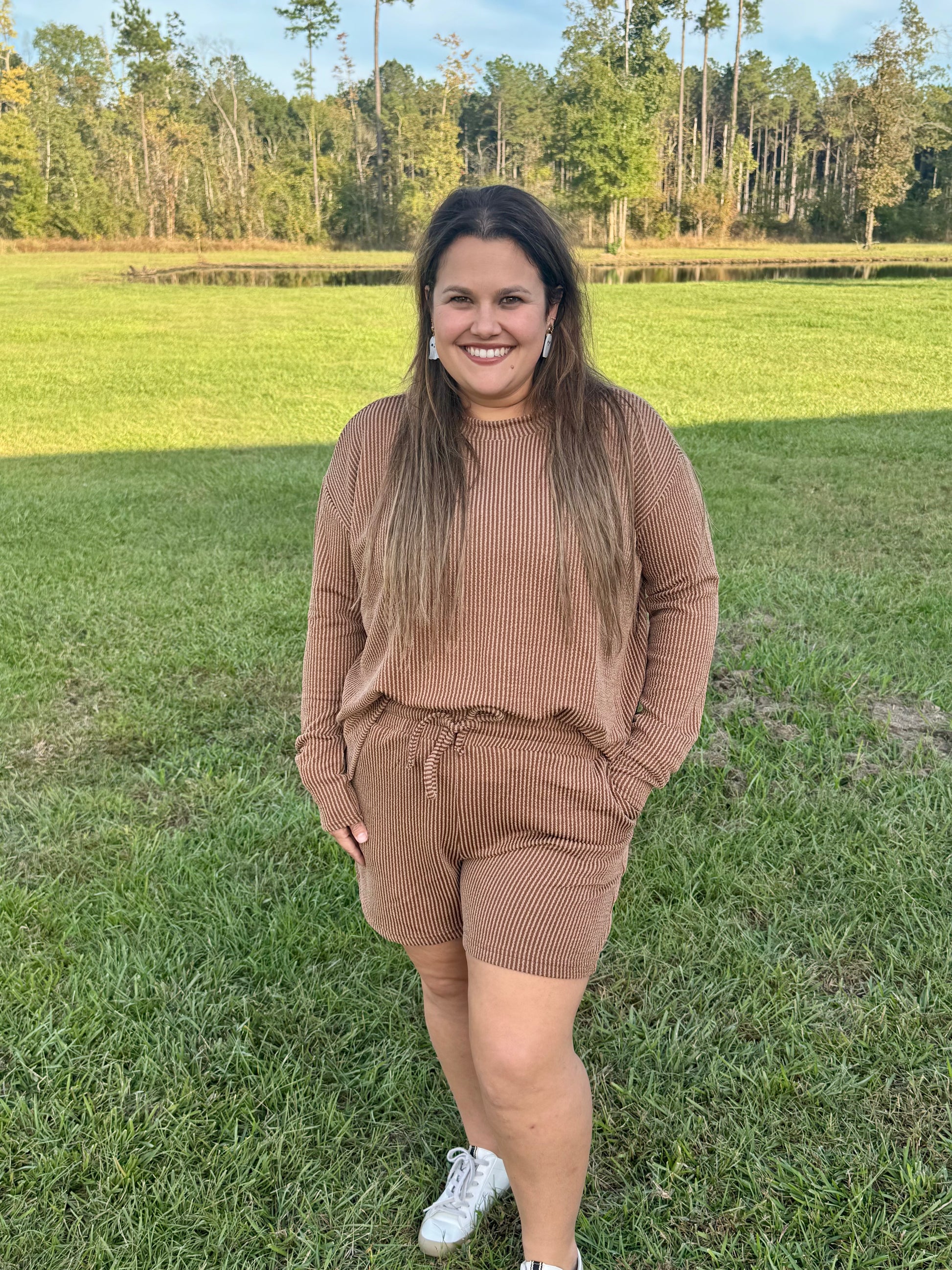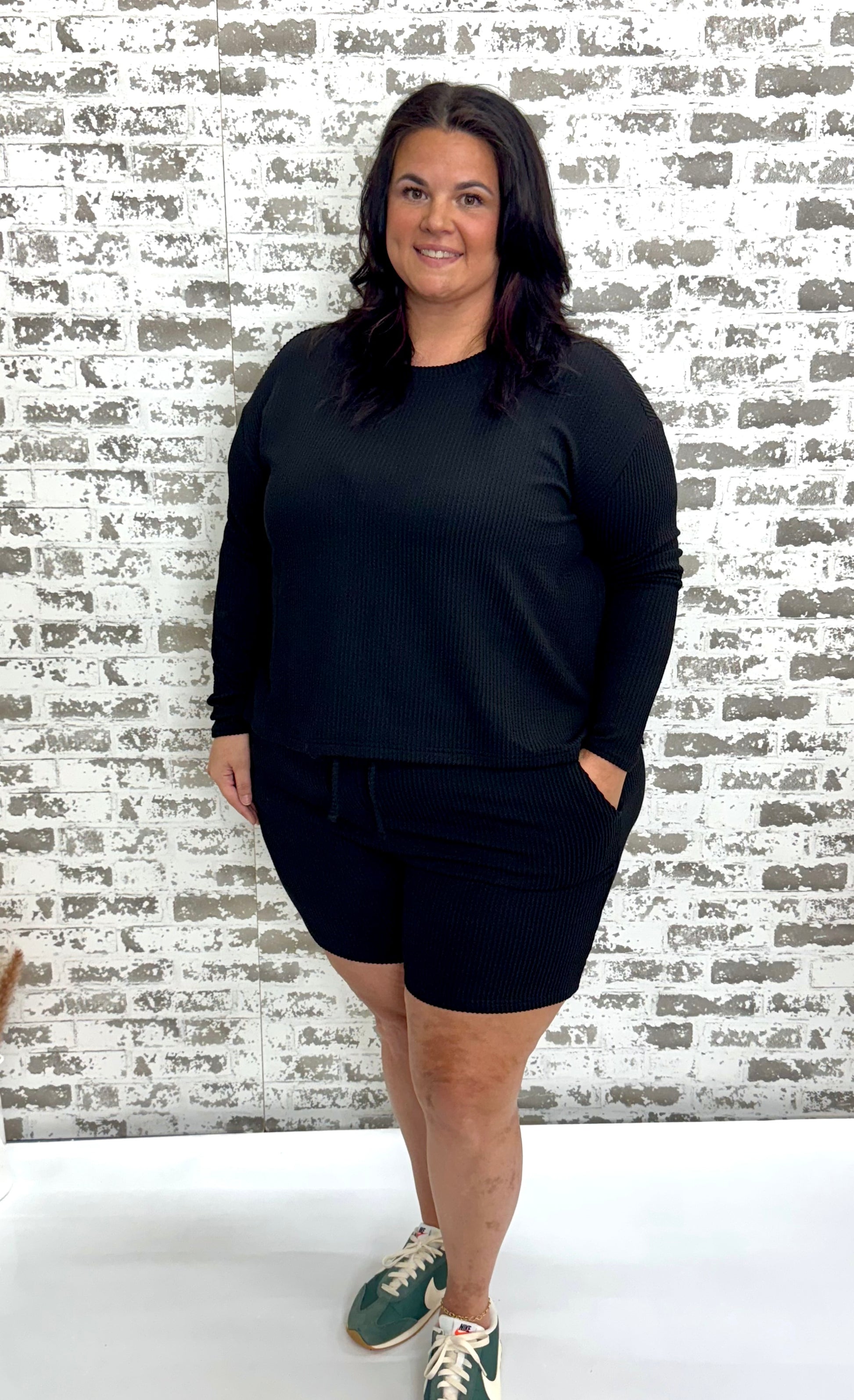 Stay cozy and stylish with the Pretty in Lounge Set, featuring a ribbed long sleeve tee and matching shorts. Perfect for lounging or casual days, this set combines comfort with a flattering fit.